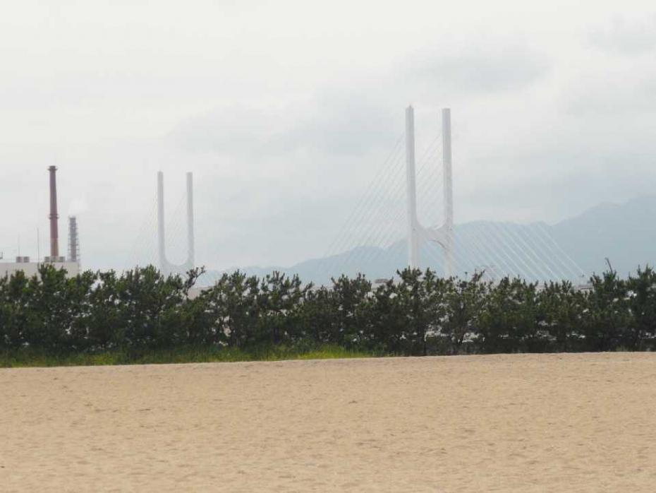 | 潮芦屋ビーチから見る潮芦屋ビーチに広がる白浜とその向こうに見える東灘浜芦屋大橋 |