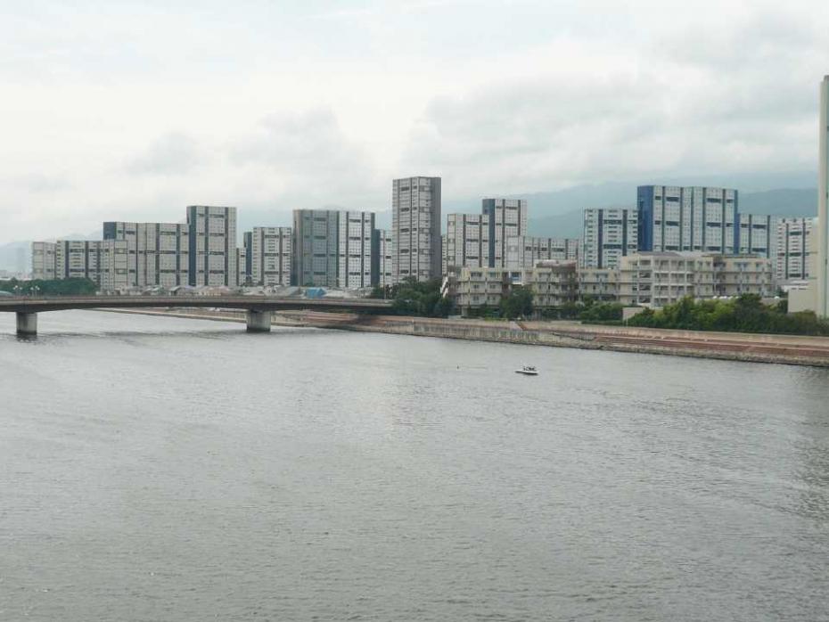 | 県道573号線夙川橋から見る芦屋キャナルパークとその向こうに見えるUR都市機構芦屋浜団地 |