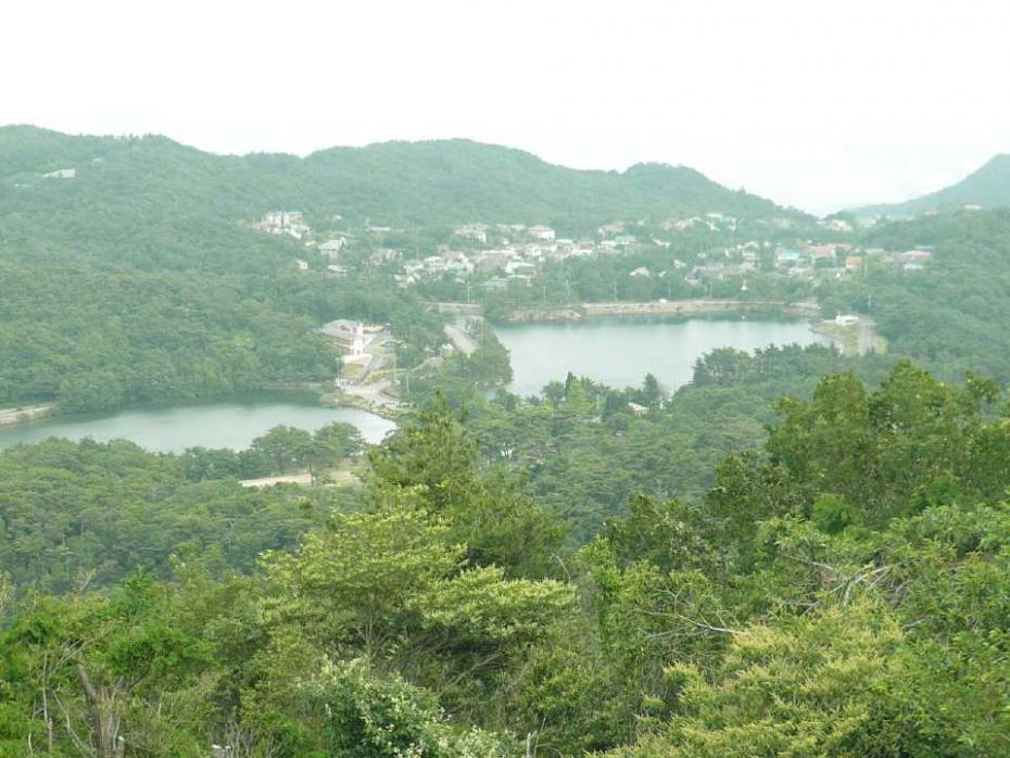 | 東六甲展望台から見る眼下に奥池とその向こうに見える大阪湾 |