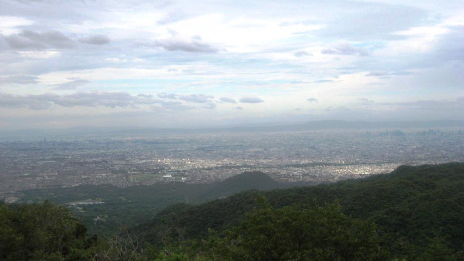 | 奥池の山を越えた向こう側に西宮市や尼崎市の街並みが見え、その中にゴルフ場や野球場が見える。 |