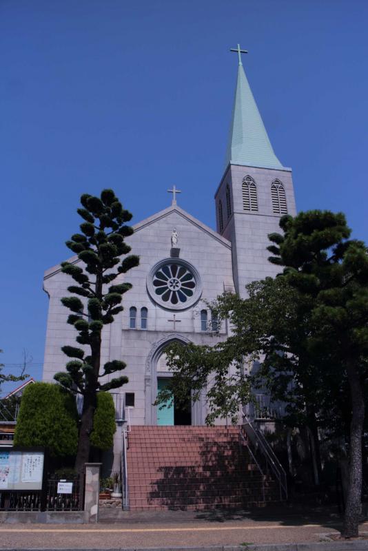 | 青空に映えるカトリック芦屋教会聖堂の花形のステンドグラスは芦屋らしい景観建物のひとつ。 |