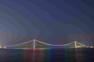 夜の明石海峡大橋は、真横に近い角度ほどイルミネーションの本来の色が分かりやすくなります。波の穏やかな日はイルミネーションが海面を染めます。 撮影:正中 亮 |