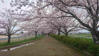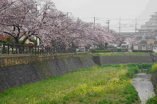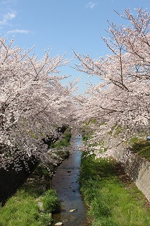 播磨中学校校舎横の喜瀬川右岸から見る春・桜並木 |