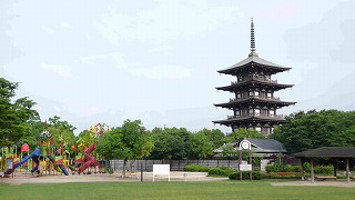 加古郡播磨町の野添北公園内:芝生広場から見る素適な子ども遊戯・気軽に入れるお茶処「蓬生庵」・圓満寺さんの五重の塔 |