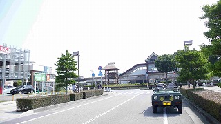 JR土山駅南側メイン道路から見る土山駅・駅前ロータリーの古代風の時計台 |