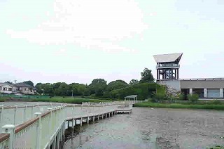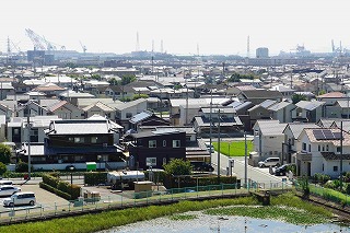 兵庫県立考古博物館の展望塔から見る喜瀬川河口方面の播磨町町内 |