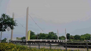 播磨町喜瀬川沿いから見る欄干に鉄琴が組み込まれた吊り橋風の「メロディー橋」 |