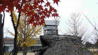 野添北公園にある蓬生庵の横から見る秋色に染まった木々とはだかの池 |
