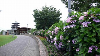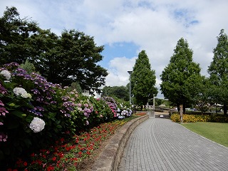 播磨町野添 であい公園西側入口から見るほぼ満開のアジサイ・お花畑の向こうに円形の屋根・シェル型とR型屋根を合わせた素敵な「であい公園」の管理棟・・・その向こうに五重の塔 |