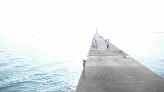 播磨町人工島・防波堤から突堤(赤灯台)から見る播磨港・播磨灘:突堤で魚を釣る人達 |