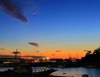 あえのはま広場前から見る夕暮れのあえ漁港 |