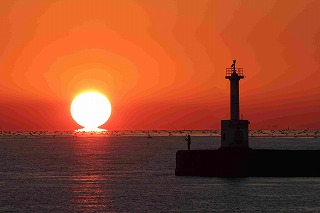 明石市大久保町江井ヶ島海岸から見る冬の日没シーン(だるま夕陽) |