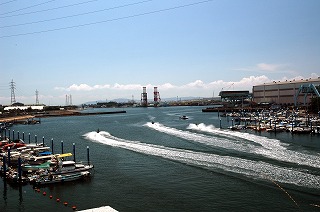 古宮漁港(播磨漁協)から見る播磨大橋、繋留されたプレジャーボート |