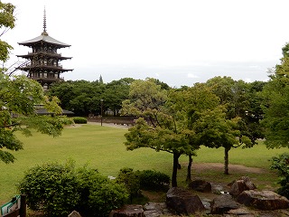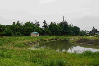 大中遺跡公園内から見るみどりの中に建つ古代建造物 |