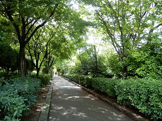 であいのみち(ふるさと橋付近)から見る園路と季節の草木あふれる緑道 |