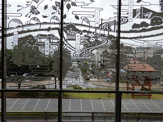 ガラスに施してあるのは町民の交流の場であり、ガラス越しには駅から人工島まで南下する道路や、ひらけた町の風景を見ることができます。