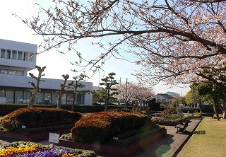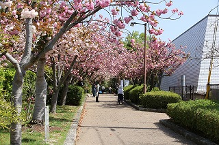 であいのみち(郷土資料館前)から見る播磨町郷土資料館前のヤエザクラ |
