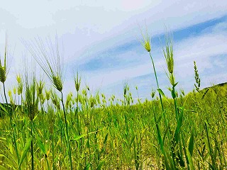 志方町の大麦畑です。撮影時は青々としていて、青空によく映えていました。よく熟せば黄金色の風景を見ることができます。これぞ、東播の農地の風景だと思います。