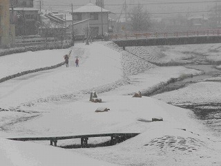 私達、町(播磨町)の散歩コースとして賑わっています。喜瀬川沿いのコースに珍しく積もった雪化粧。
