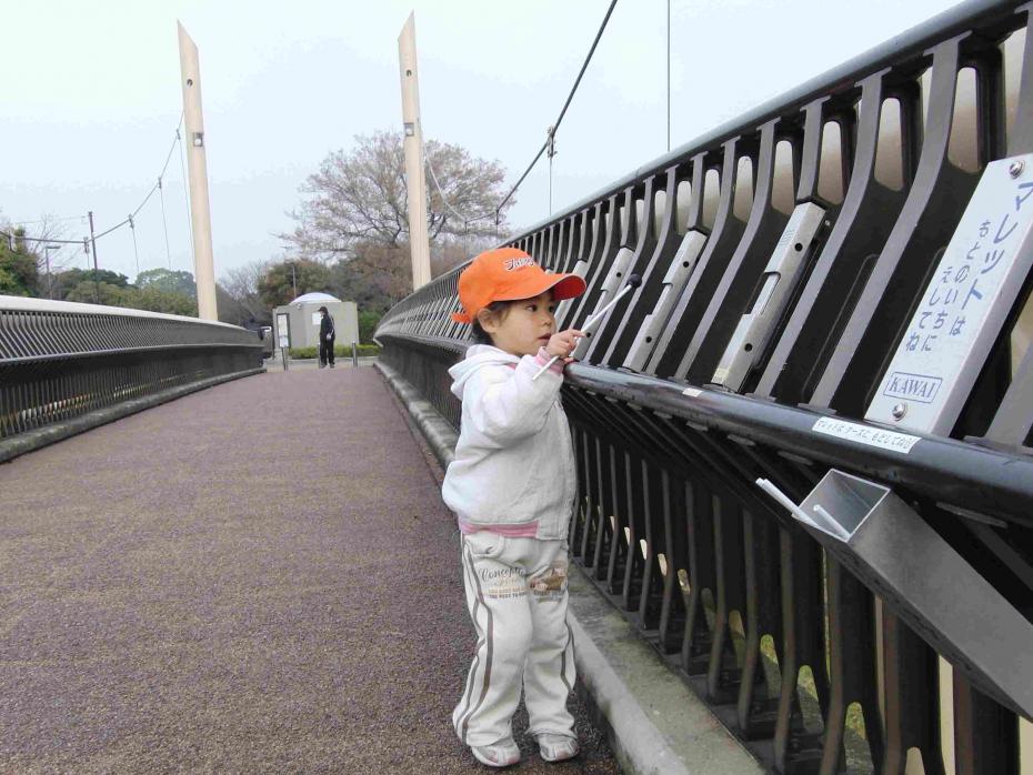 異名をもつ?ふるさと橋・であい橋・メロディー橋と親しまれ欄干に組み込まれた鉄琴を、備え付けのマレットで懐かしき童謡「ふるさと」を奏でることが出来ます。