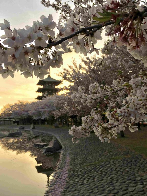 桜の時期に野添北公園の池に映る桜並木や、背景にある円満寺の塔が美しいのでここを選びました。