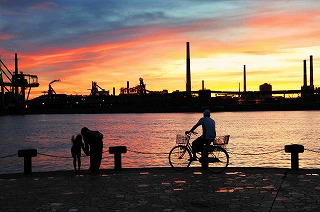 町の3割を占める人工島があり、休日には魚釣りやジョギングコースとしてにぎわいます。夜には工場に灯りがともり、夜景もおススメです。