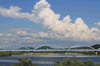 昭和55年に完成した全長426mの送水管2条を渡している工業用水送水管の橋です。平荘湖や権現ダムの工場用水を右岸の東神吉町から左岸の加古川町へ渡し、臨海部の工場地帯へ1日約2万トンを配水しています。上は歩道橋になっていて、自転車・歩行者専用の市道としても役立っています。清流が美しい加古川の景観の中で、鮮やかなセルリアンブルーのアーチ型をしたこの橋は独特の存在感があります。