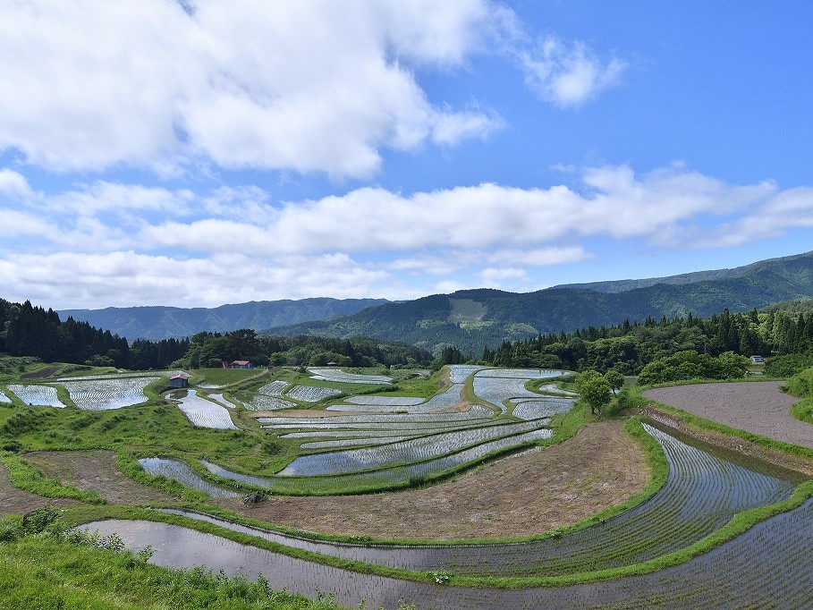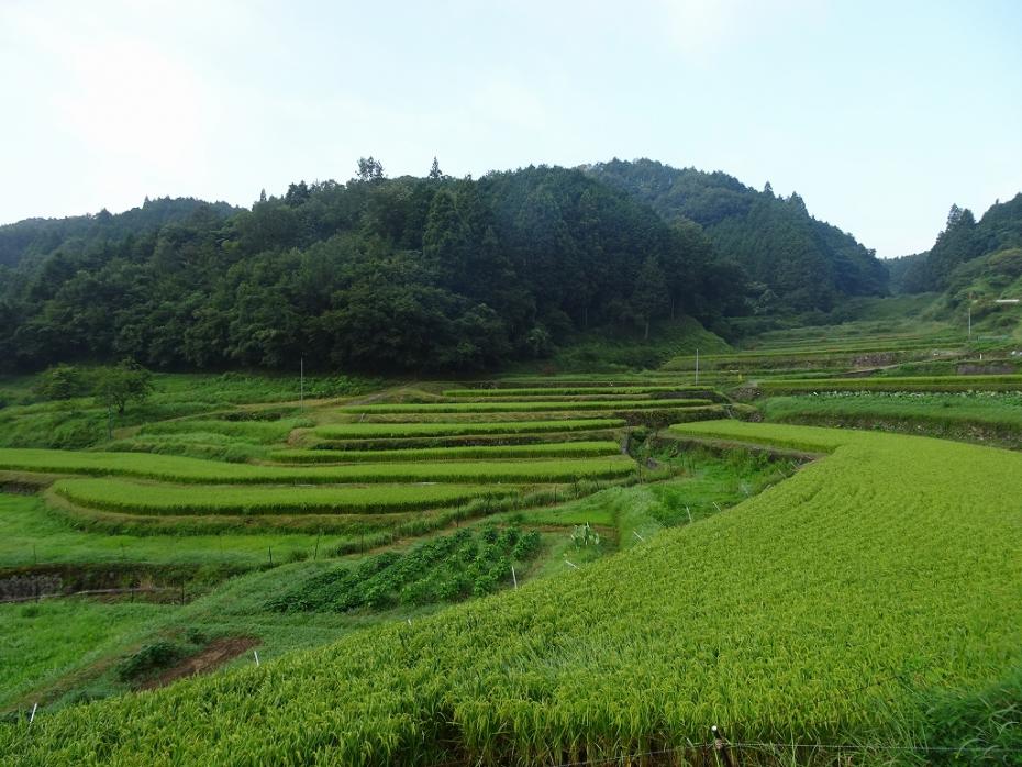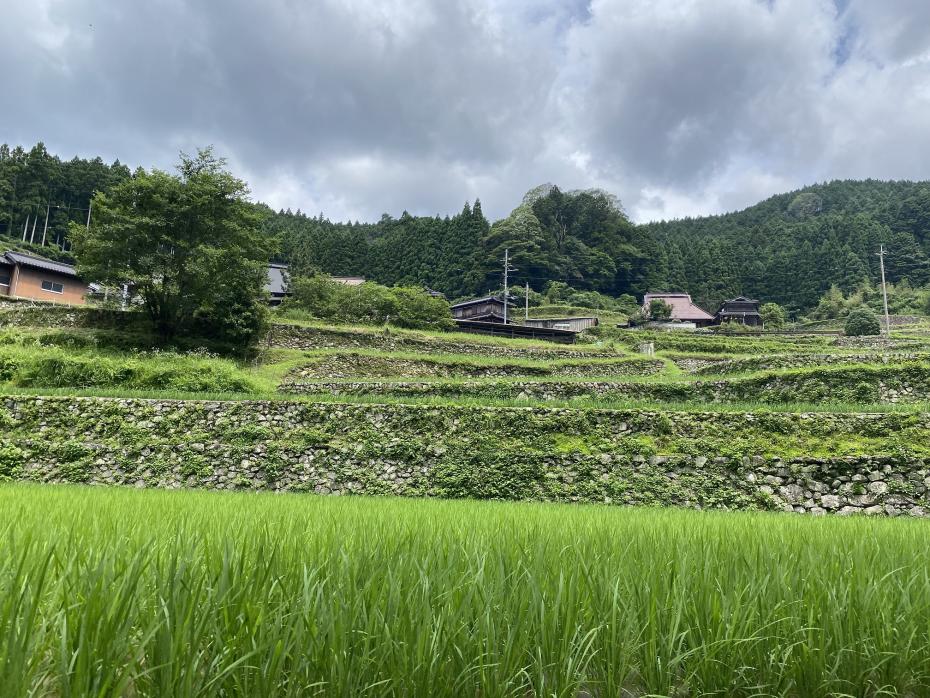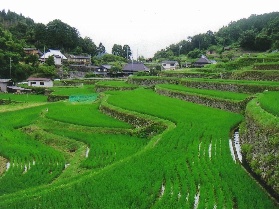 <見える景観> 反りが美しい棚田の石積みと集落風景