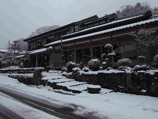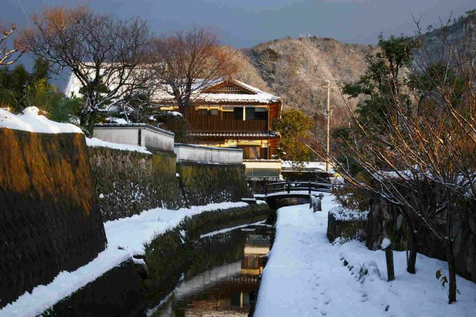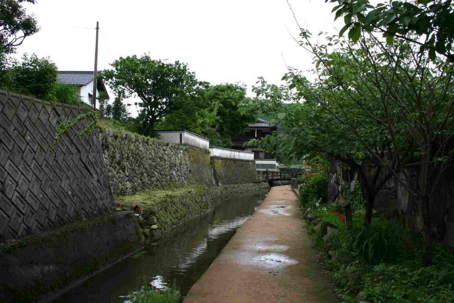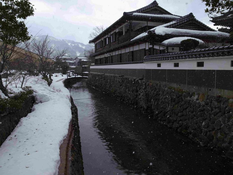 | 川沿いに連続する石垣や家屋のある落ち着いた景観。積雪時は歩行が困難になるが雪国の情緒を感じることができる景観となる。 |