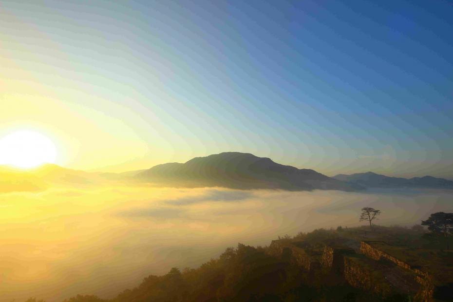 竹田城跡を遠景から見下ろすことができ、雲海に包まれた城跡は、まさに「天空の城」。雲海は刻一刻と姿を変えるため同じ景色はほとんどなく、見る者を飽きさせません。 撮影:朝来市産業振興部観光交流課 |