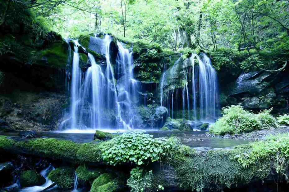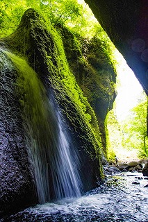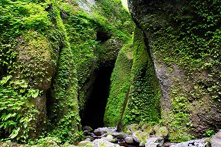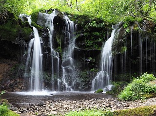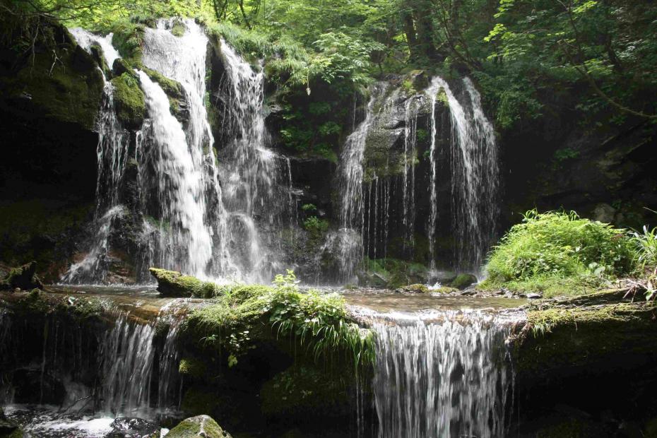 国道482号線にあって神鍋山から噴出した溶岩でできた滝や淵などの様々な地形と豊富できれいな水流による人工的には造り得ない自然な景観が見られる。 |