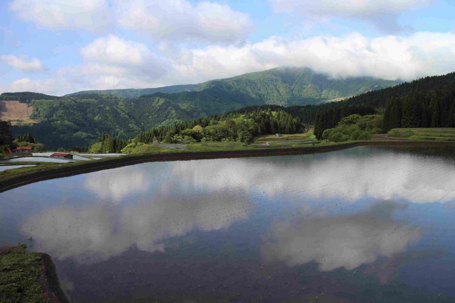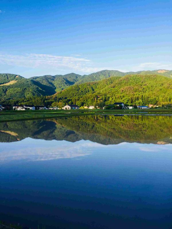 | 豊岡市日高町栗栖野国道482号線沿いから見る田植え直後の山々の写し鏡 |