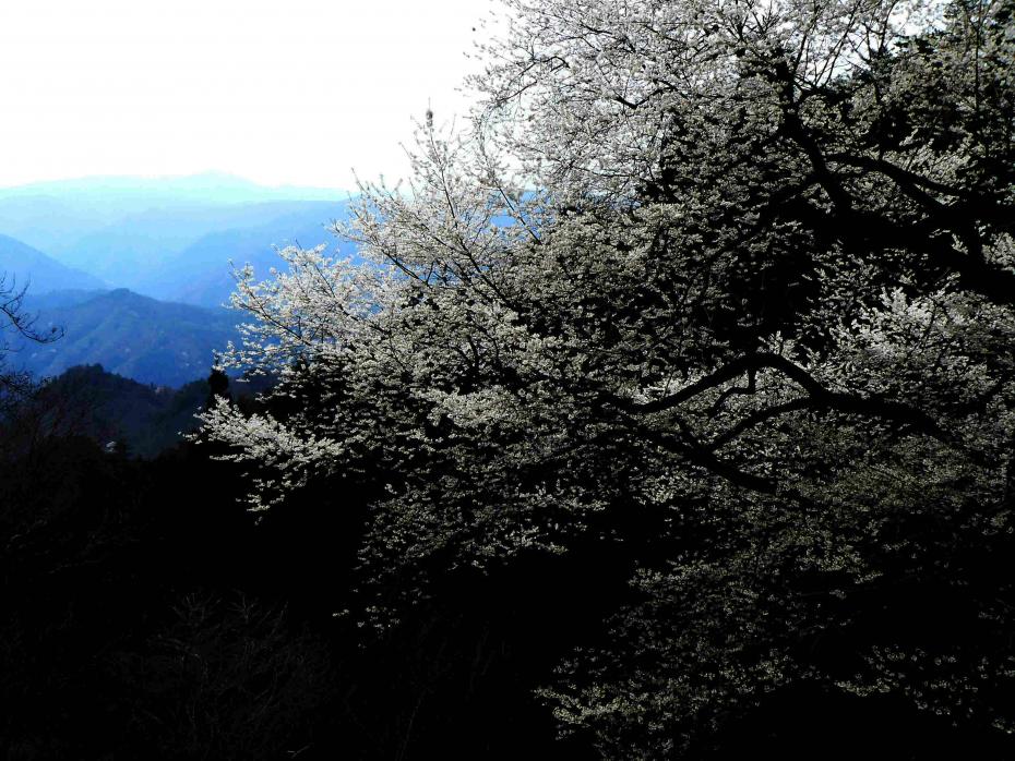 | 養父市大屋町樽見の「樽見の大桜」から見る県内最大と言われるエドヒガンの古木を取り巻く山々 |