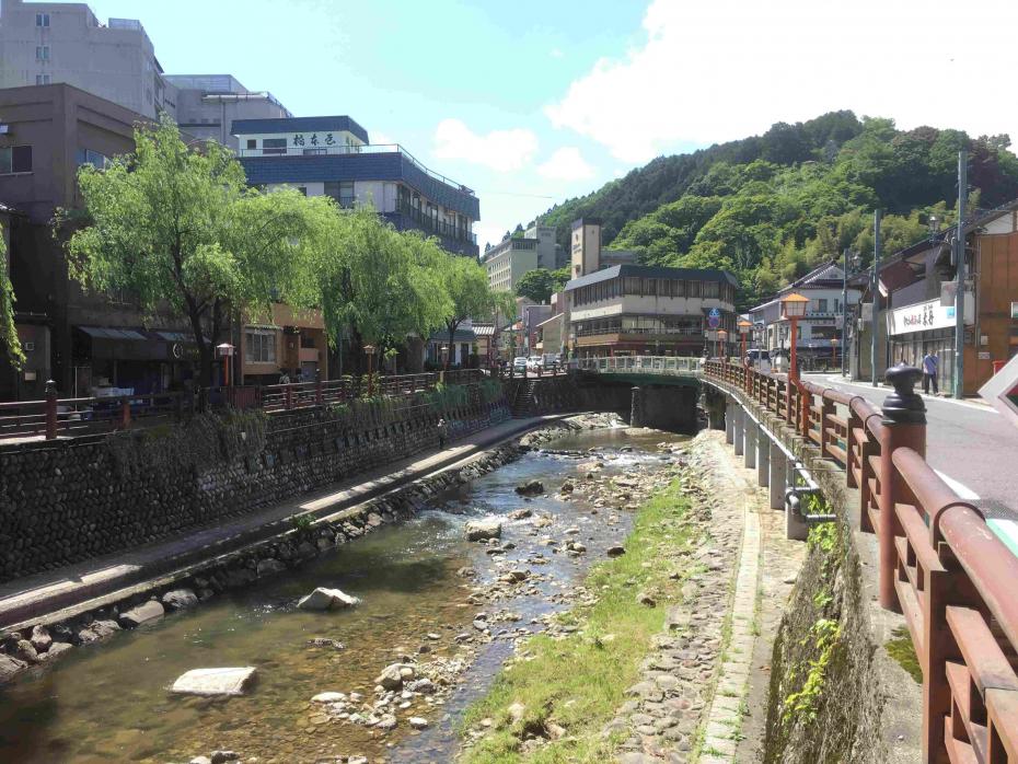| 大谿川の太鼓橋から、木造3階建旅館のまちなみと柳並木や玄武岩の石積みがよく見えます。外湯に行く浴衣姿の宿泊客の駒下駄の音が、カランコロンと心地よく響きます。 |