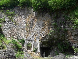 | 豊岡市赤石 玄武洞公園から見るむき出しとなった巨大な玄武岩塊群や玄武岩の柱状節理により形成された石柱群 |