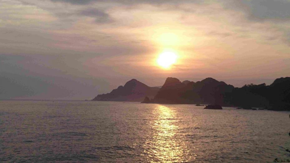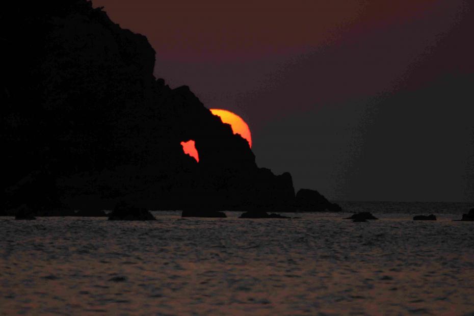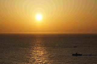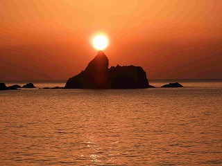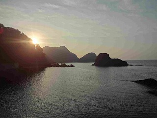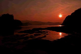 | 香美町香住区下浜地区 三田浜へ向かう海沿いの道から見る夕日にかたどられる但馬松島の陰影 |
