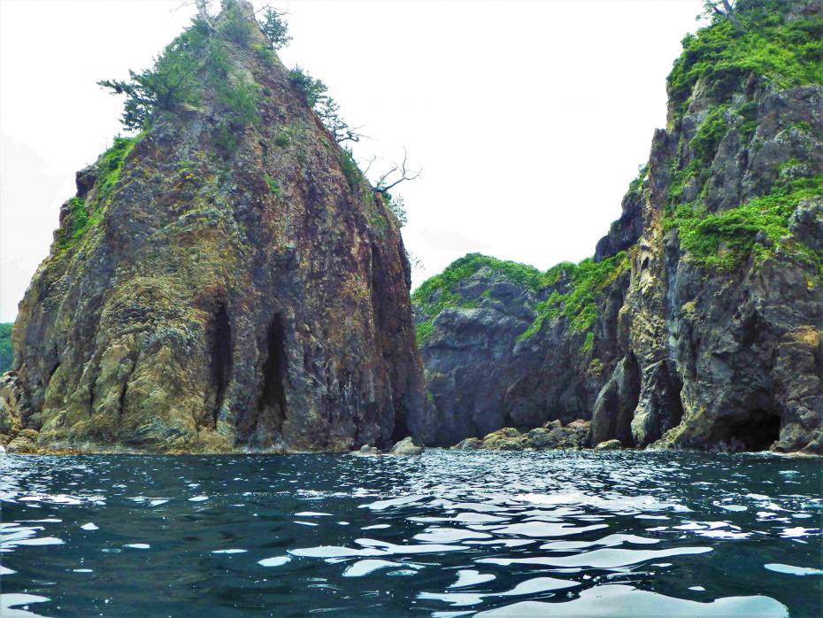 | 但馬海岸の必見スポットの中で、手軽に見られちょっとユーモラスな「はさかり岩」。県道11号香美久美浜線の道路沿いに見えます。「はさかる」とは「はさまる」の方言です。 |