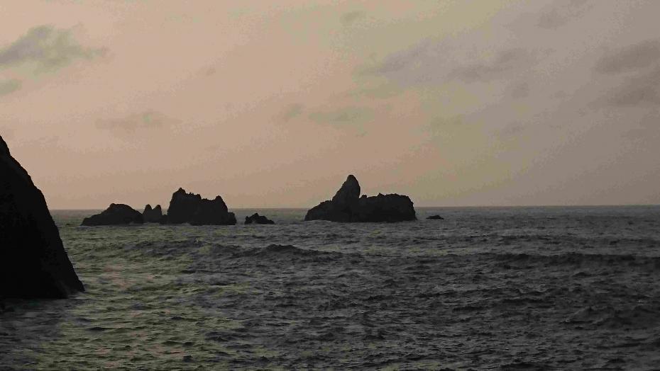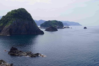| 香美町香住区大引の鼻から西を望むと、黒島、白石島、そして遠くには日本一の海面からの高さを誇る御崎灯台がある伊笹岬が望めます。 |
