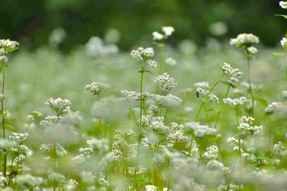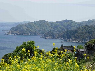 | 余部鉄橋の北、日本海を見下ろす山の中腹に平家の落人伝説で有名な御崎集落がある。ひな壇状に建つ民家の瓦屋根の黒、自生する平家蕪の黄、海の青のコントラストが美しい。 |