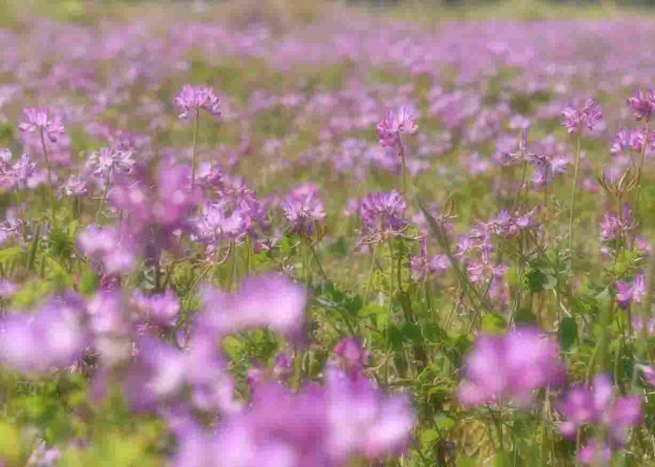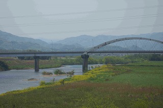 | 豊岡盆地をゆったり流れる円山川下流域。堤防の上の国道から広々とした河川敷が見えます。春には、ハマダイコン、菜の花、月見草、キンケイソウなどの花が次々咲きます。 |