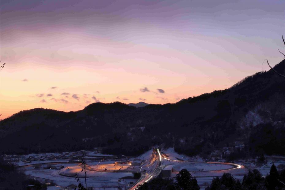 | 日没後は静かな集落にあって控えめに光るイルミネーションが演出する穏やかな雰囲気の景観。 |