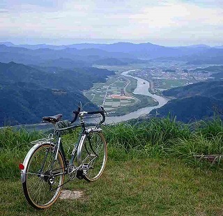 | 豊岡市円山川左岸国道178号北側の堤防上の道から見る円山川と来日岳 |