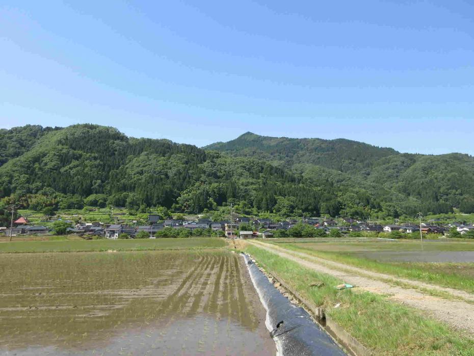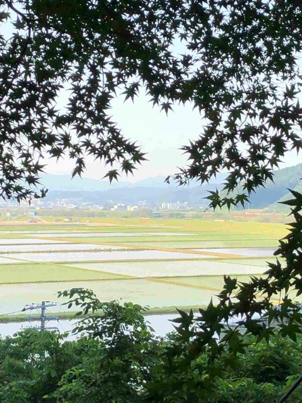 | 笠波峠からハス園に向かう途中にひろがる風景です。遠くに山々が並び、青々とした苗がとてもきれいです。 |