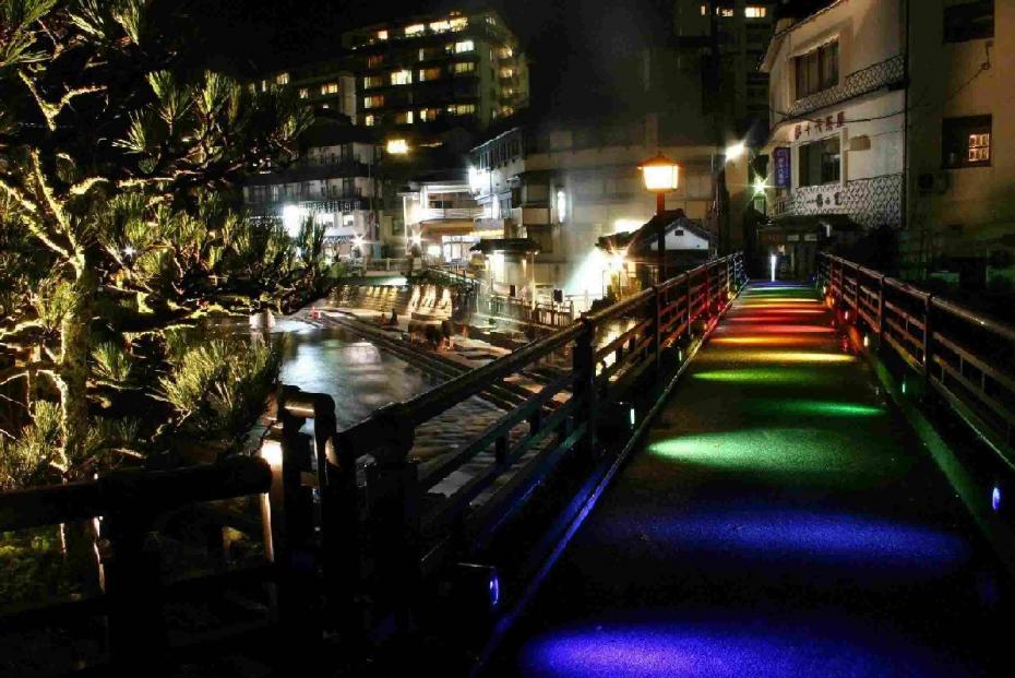 温泉街の中心部を流れる川がつくる景観を生かし、川辺には遊歩道や足湯が整備され来訪者でにぎわう。日没後はライトアップされ情緒豊かな景観を楽しむことができる。 撮影:新温泉町建設課地域整備係 |