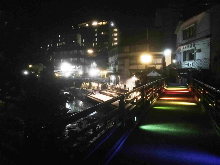 | 新温泉町湯 湯村温泉街の繁栄橋から見る春来川の風景(夜間) |