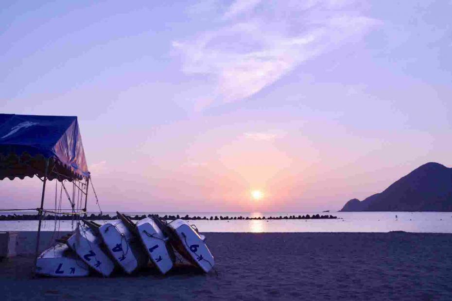 | 新温泉町城山の展望台から見る諸寄漁港と夕日の風景 |