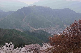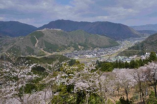 | 桜の名所立雲峡は竹田城址を遠望する東側随一のビューポイント。桜の季節にここから望むと、竹田城址、竹田城下町の屋並み、立雲峡の満開の桜が一度に楽しめます。 |