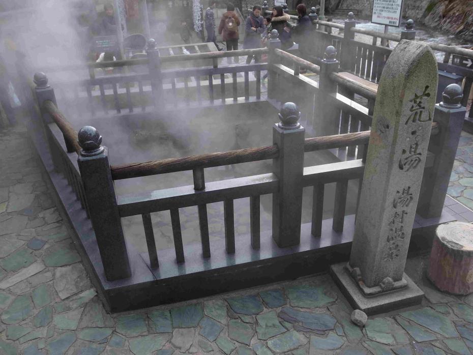 | 湯けむりの立つ春来川沿いの散策路の荒々しい雰囲気が感じられる景観。 |