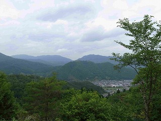 | 昔、山に八木城があったそうです。その城下町だった八木地区の黒い瓦屋根の美しいまちなみが国道を挟んで見えます。 |