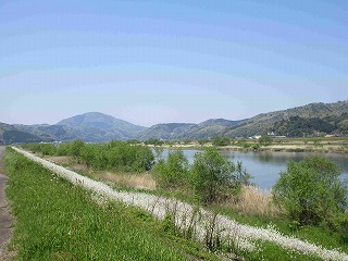 | 堤防上の道から北側を見ると、ゆったりと流れる円山川とともに、遠くに来日岳が見えます。川と緑の土手がどこまでも続いているように感じられる広々とした景色です。 |